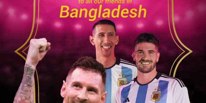 কাতার বিশ্বকাপ চলাকালীন লিওনেল মেসিদের জন্য গোটা দেশ সেজেছিল। আর্জেন্টিনার পতাকায় ছেয়ে গিয়েছিল পাড়া মহল্লায়। বড় পর্দায় খেলা মানেই বাড়তি আনন্দ, উন্মাদনা। পাগলাটে এই উন্মাদনার কারণেই আর্জেন্টাইনদের হৃদয়ে জায়গা করে নিয়েছে লাল সবুজের বাংলাদেশ। তাইতো নানা উপলক্ষ্যে, আয়োজনে বাংলাদেশের সমর্থকদের কথা মনে করে আর্জেন্টিনা ফুটবল। সেই ভালোবাসার প্রতিদান ভালোবাসায় দিচ্ছেন তারা।