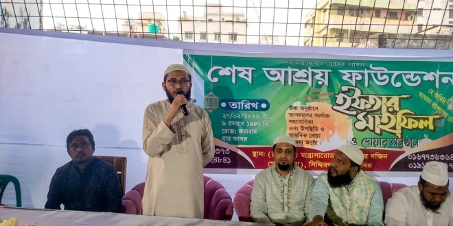 নিজস্ব প্রতিবেদক: নারায়ণগঞ্জের সিদ্ধিরগঞ্জে পবিত্র রমজান মাস উপলক্ষে শেষ আশ্রয় ফাউন্ডেশনের উদ্যোগে মিলাদ ও ইফতার মাহফিলের আয়োজন করে। অনুষ্ঠানে স্থানীয় গণ্যমান্য ব্যক্তি, সমাজকর্মী, সাংবাদিকসহ বিভিন্ন পেশা ও শ্রেণির মানুষ অংশগ্রহণ করেন। সরেজমিনে দেখা যায়, এটি কেবল ইফতার নয়, বরং মানবিক সহায়তা ও সামাজিক দায়বদ্ধতার এক অনন্য মিলনমেলা ফাউন্ডেশনের সভাপতি ফরহাদ হোসেন জীবন সভাপতিত্বকালে বলেন, শেষ আশ্রয় ফাউন্ডেশন শুধু একটি সংগঠন নয়। এটি অসহায় ও সুবিধাবঞ্চিত মানুষের শেষ ভরসাস্থল হয়ে উঠতে চায়। আমরা চাই সমাজের প্রতিটি স্তরে মানবিক সহায়তার হাত পৌঁছাক।সাধারণ সম্পাদক সাজ্জাদ হোসেন সোহাগ বলেন, “আমাদের লক্ষ্য শুধুমাত্র দান-অনুদানে সীমাবদ্ধ নয়। শিক্ষা, স্বাস্থ্য, কর্মসংস্থান ও সামাজিক সচেতনতা বৃদ্ধির মাধ্যমে একটি শক্তিশালী, আত্মনির্ভরশীল সমাজ গড়ে তোলা আমাদের মূল উদ্দেশ্য।