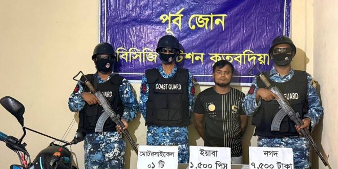 বুধবার (২৯ এপ্রিল ২০২৬) দুপুর ২টার দিকে কুতুবদিয়া থানাধীন বড়ঘোপ ঘাট সংলগ্ন এলাকায় কোস্ট গার্ড স্টেশন কুতুবদিয়ার সদস্যরা গোপন সংবাদের ভিত্তিতে বিশেষ অভিযান পরিচালনা করেন। অভিযানে একটি মোটরসাইকেলে থাকা সন্দেহভাজন এক ব্যক্তিকে তল্লাশি করে প্রায় ৭ লাখ ৫০ হাজার টাকা মূল্যের ইয়াবা ও নগদ ৭ হাজার ৫০০ টাকা উদ্ধার করা হয়।
